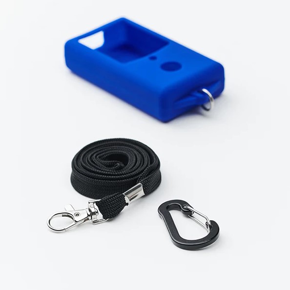 Silcone skin for added protection, includes small carabiner for attachment to lanyard, belt loop or other equipment.