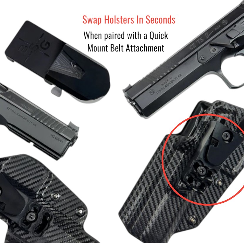 Designed to be paired with the Quick Mount Belt Attachment, the mounting block can be attached to the listed OWB holsters