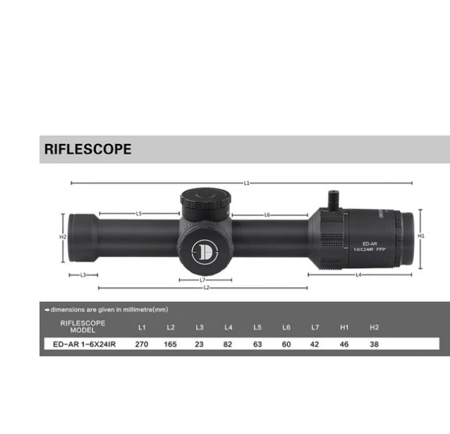 The ED-AR 1-6X24IR FFP scope is an excellent choice for anyone looking for a versatile and compact optic. The 1-6x magnification range makes it perfect for both close-quarters use and medium-range shooting, offering great flexibility in the field. The glass quality is impressive – bright, clear, and sharp even at maximum zoom. The illuminated reticle is crisp and easy to use in different lighting conditions, and being in the first focal plane ensures accurate holdovers and measurements across all magnifications. The build quality is solid and durable, while the short and lightweight design keeps the rifle well-balanced without compromising on performance. The 30 mm tube provides reliability and consistency for adjustments.
