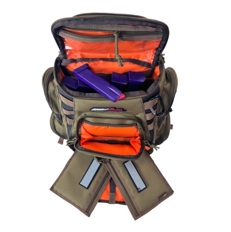 Included are two mini pistol insert sleeves, intentionally compact so as to lay flat and optimize storage capacity. These sleeves accommodate full-size Production division guns and most Production Optic guns. For large Standard or Open guns we offer larger pistol insert sleeves which can be purchased separately. The upper compartment houses a DAA 6-Mag Rack, secured by Velcro for easy access or removal as needed.